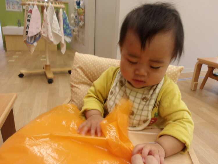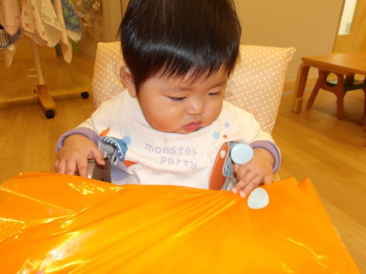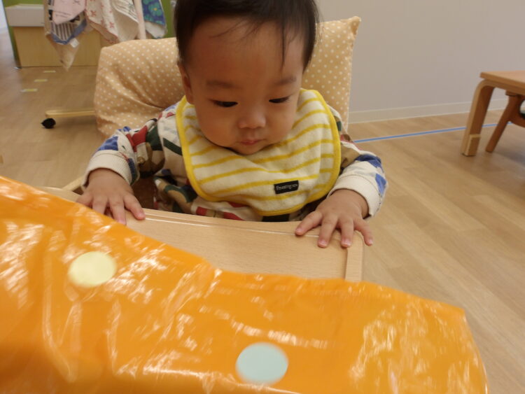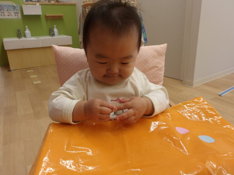 シールが手につくと『なんだろう?』と不思議そうに見ていました