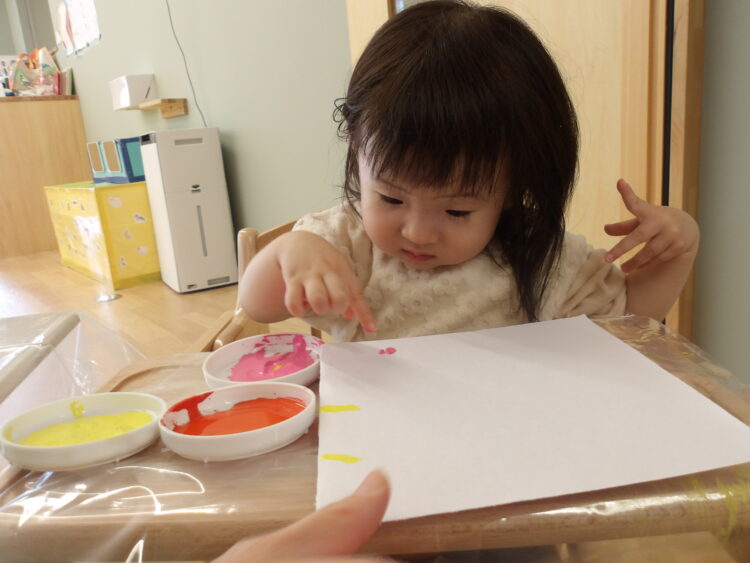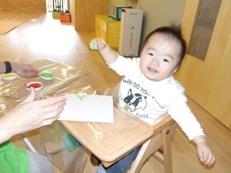 絵の具を指につけると不思議そうな顔をしつつも、チョンと紙につけたり手のひら全体に伸ばしたりして楽しみました![]()