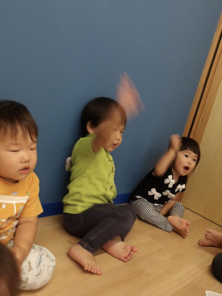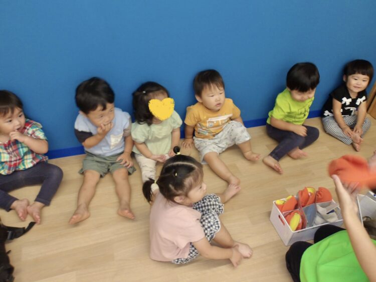 お外へ行く前に、みんなで座ってカラー帽子のかぶり方を聞きます🧢