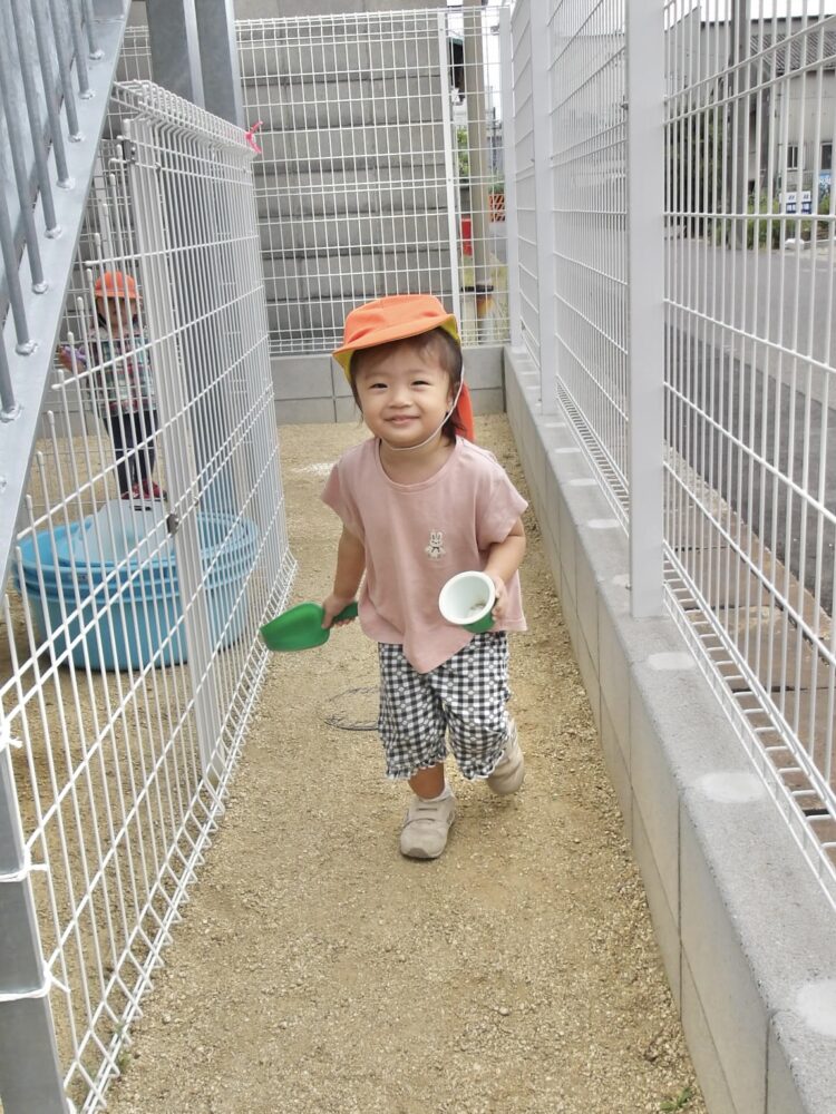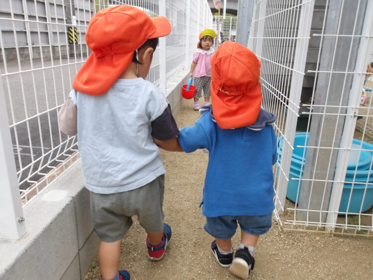 ここはみんなの大好きな細い道です。お友達と仲良く手をつないで歩いていますね♪