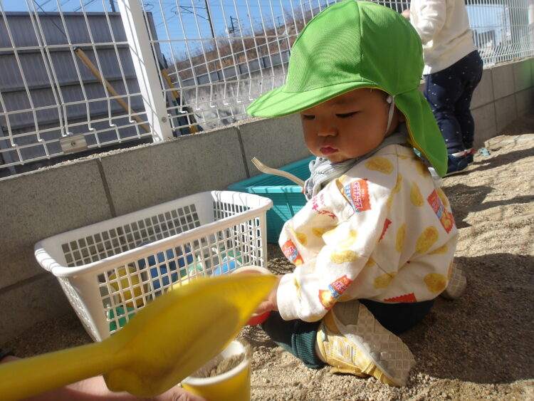 お砂場用のおもちゃカゴからいいものがないか探して、保育士がスコップの使い方を見せると、チラッと見ていました![]()