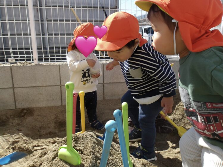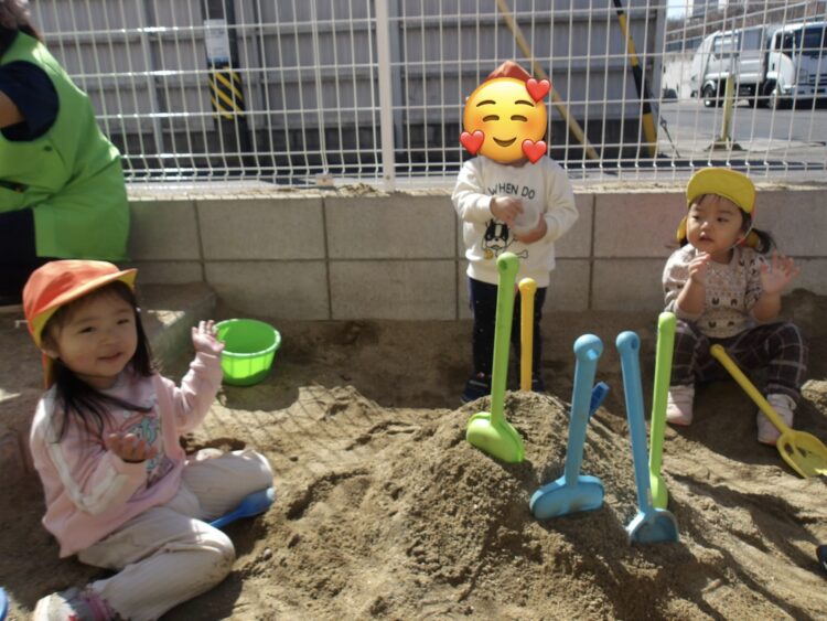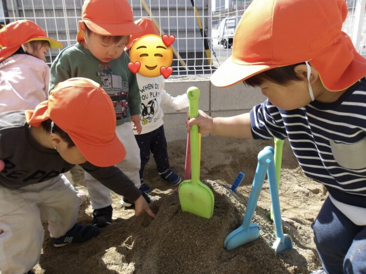 あひる組さんは、みんなで砂のお山作りを楽しんでいます。