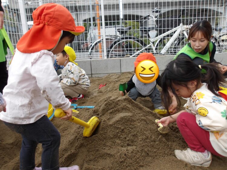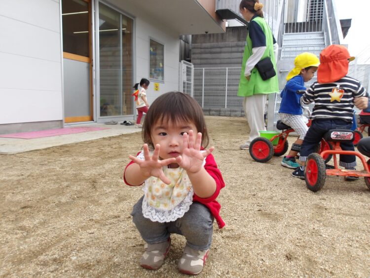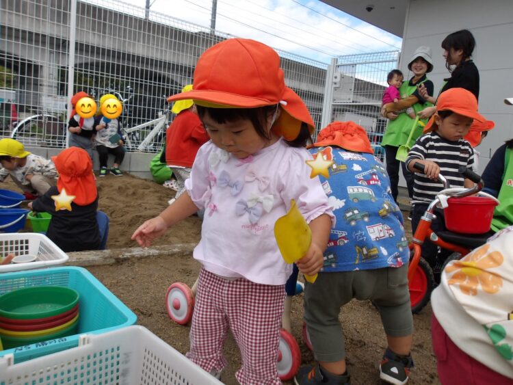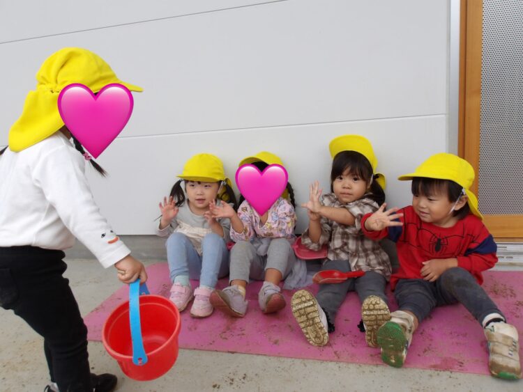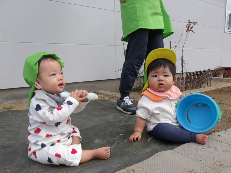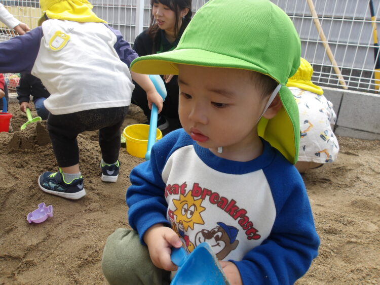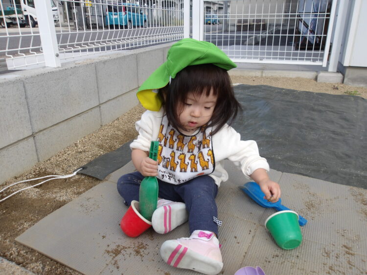 今日は乳児クラスみんな一緒に園庭に出て遊びました。雨上がりの湿った砂が型抜きやお山作りにはちょうど良く、 お砂場が大人気