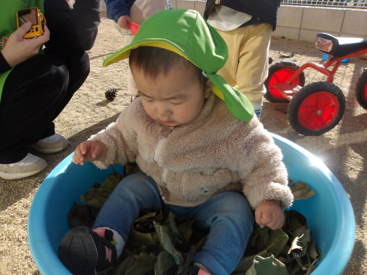 ひよこ組さんのお友だちは今日から登場した葉っぱ風呂に自分から寄って行っていました!
