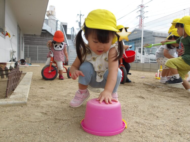 バケツをひっくり返したら、どんな形が出来るかな?とワクワク