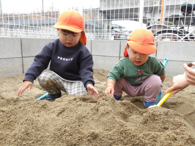 お友達に「おいで〜」と声をかけ、仲良く並んで遊んでいましたよ![]()