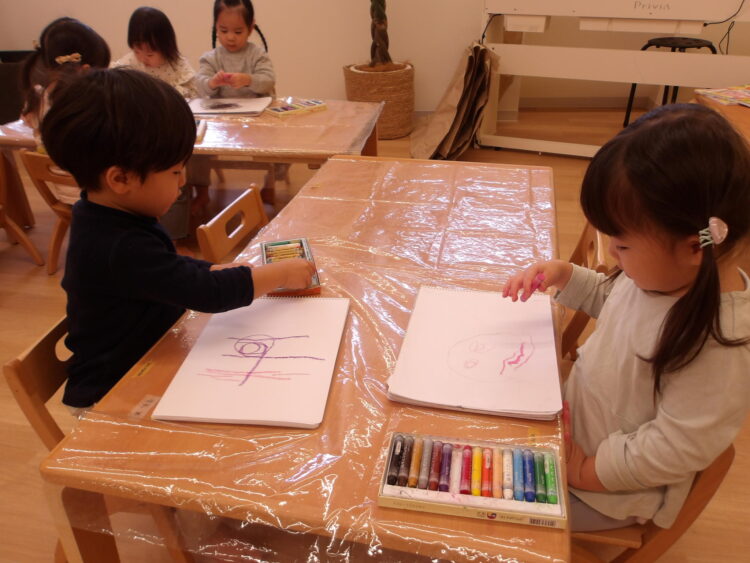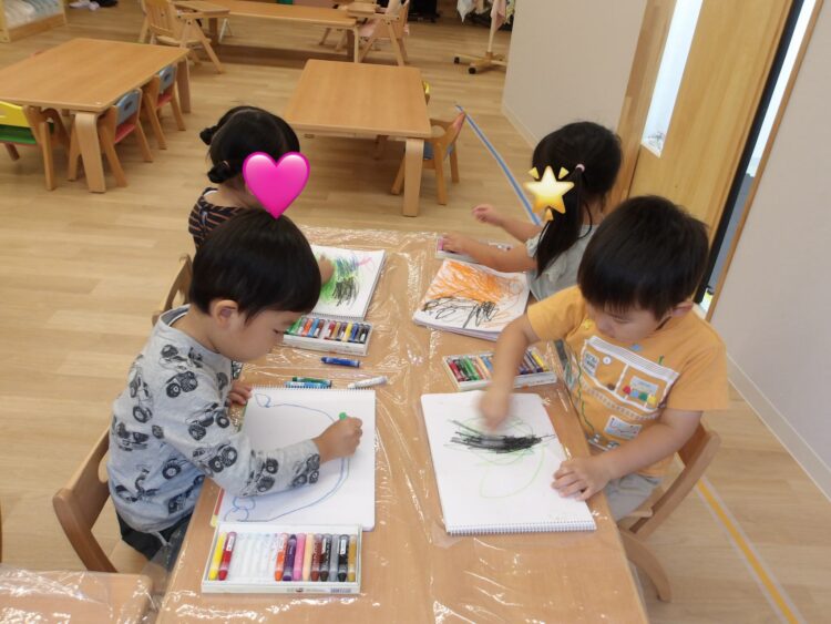 「虹」を描いたり、「レッカー車」を描いて出来上がると保育士に見せてくれます✨クレヨンの使い方に慣れ、ダイナミックに描くようになりました🎵