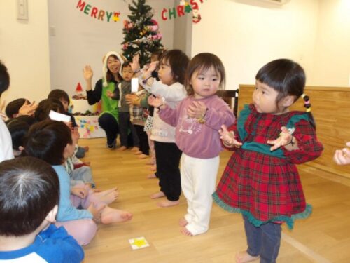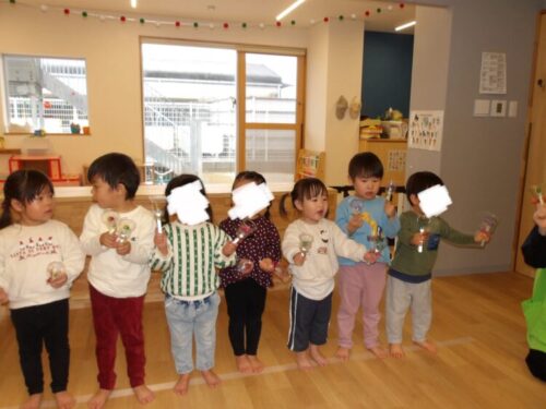 サンタさんが登場すると、声を上げて驚くお友だちやびっくりして固まってしまうお友だちもいました😄