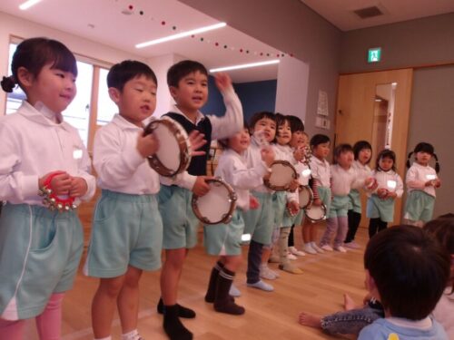 各クラスずつ前に出て、いつもの手遊びを保育士と一緒にお友だちみんなの前で発表をしたり、楽器(手首につけた可愛い鈴、保育士お手製のハンドベル、タンブリン、鈴、マラカスetct・・・)を使った演奏の発表会をしました⭐️