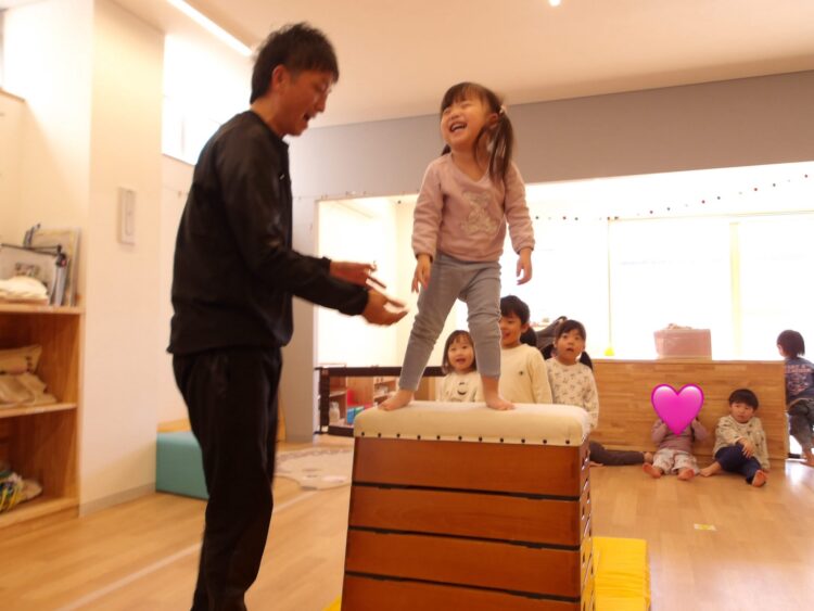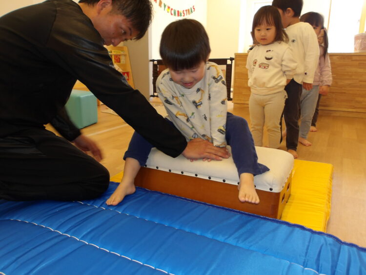 着地の時にお尻がついたり手や膝をつけないように足だけで支えて着地するという課題で、1段目からスタートし、高くなるにつれレベルが上がってくるので子どもたちも集中して跳んでましたよ😄