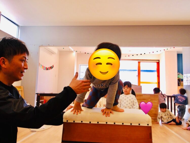ほとんどの子がキレイに足から着地して飛び越えることができたので、来週はもう一段高くして行うそうですよ😄