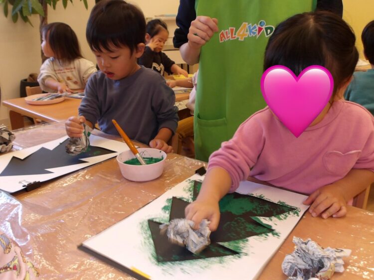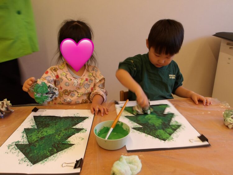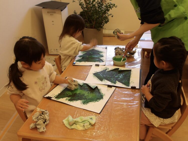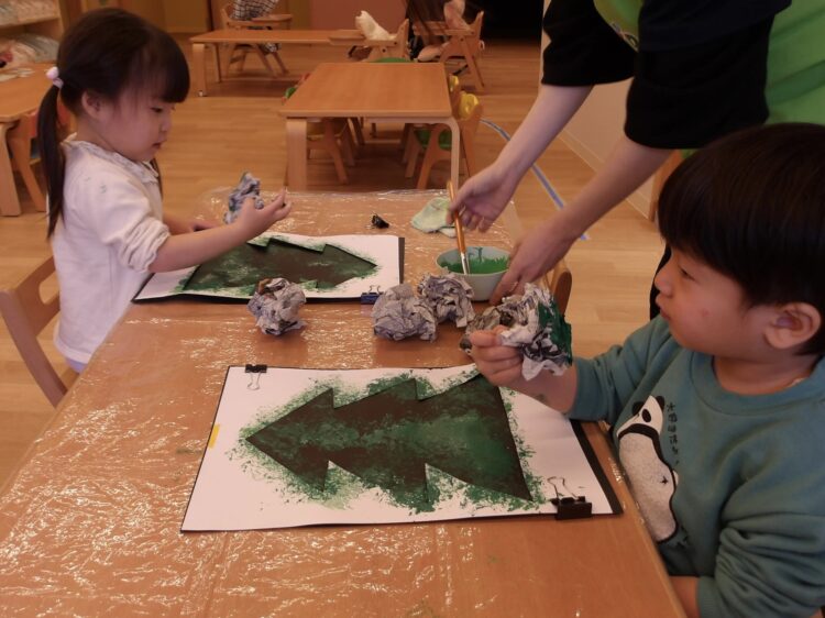 黒い画用紙の上に、クリスマスツリーの形でくり抜いた画用紙を重ね合わせ、丸めた新聞紙に絵の具をつけてポンポンとスタンプ!