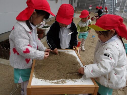 机の上ではどんぐりを使って、砂で自分の名前を描いているお友だちも😄