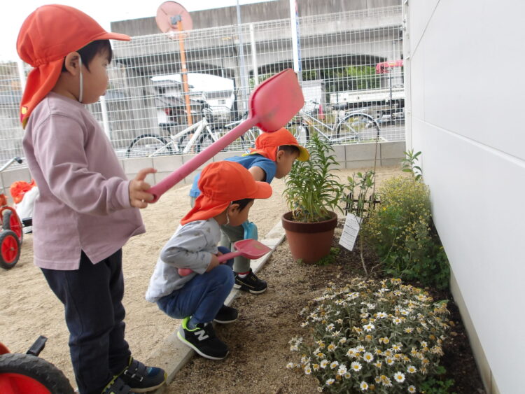 植木鉢の下から、ダンゴムシを発見しました!✨今日はダンゴムシがいっぱいいました!「見せて見せてー」と覗き込んでいます☺️