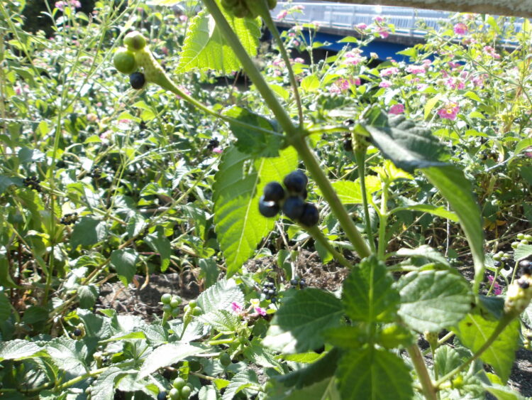 ↑ピンクの花には実がついていて「これはぶどうかな?ブルーベリーかな?」とみんなでお話しながら、みんなで一緒に観察です