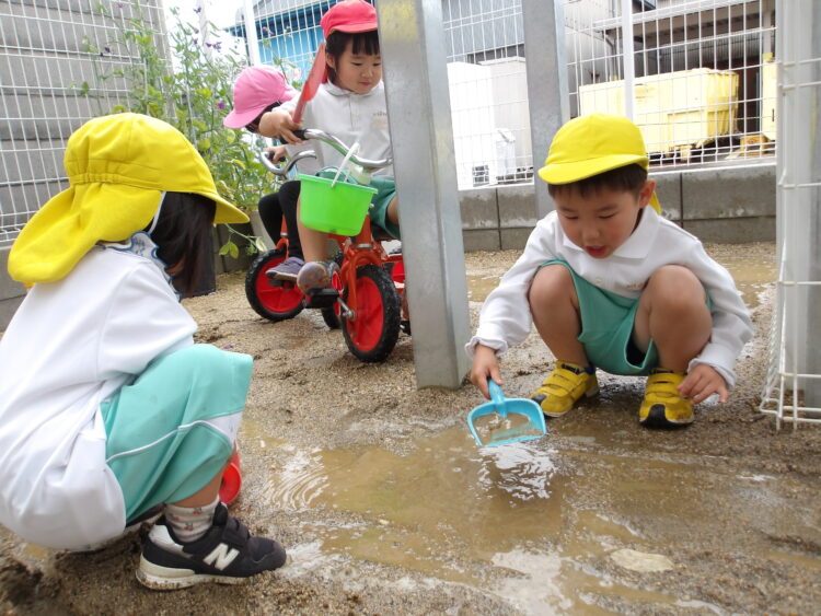 昨日の雨でできた、水たまりを発見した子ども達