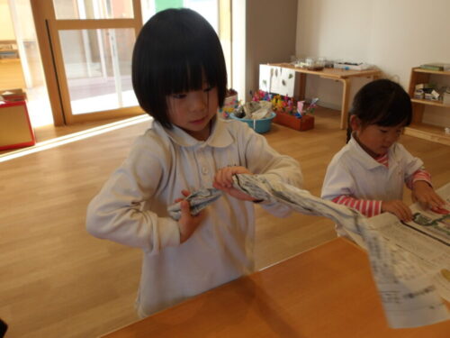 新聞紙をねじって輪っかにしてリースの土台を集りました!