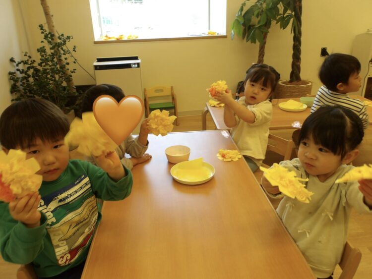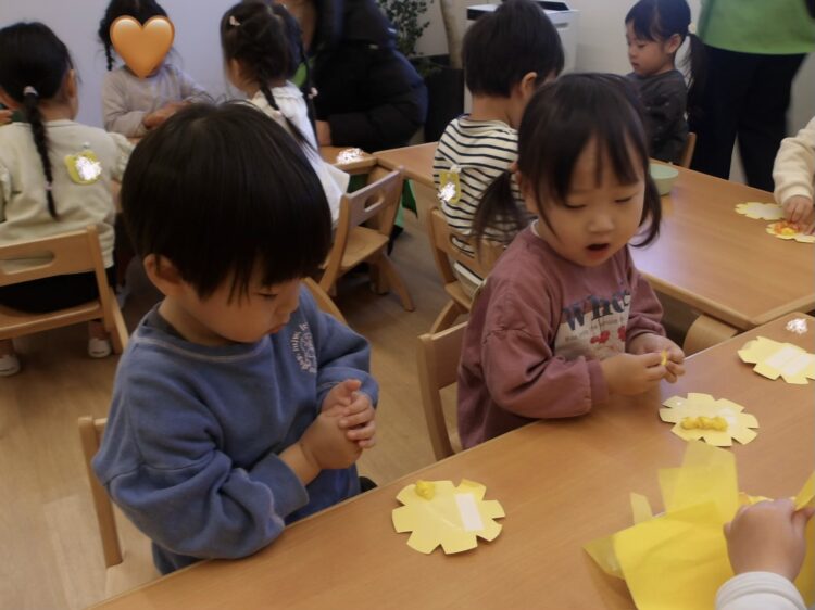 たんぽぽの制作も行いました!両面テープの上に花紙を丸めてペタッと貼っていきます。一枚ずつ取ることに苦戦する中、綺麗なたんぽぽの完成です🌼