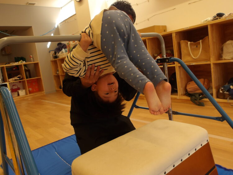 鉄棒にお腹をくっつけているよ!足を浮かせるのが怖くてドキドキしながらも頑張って挑戦しています😊
