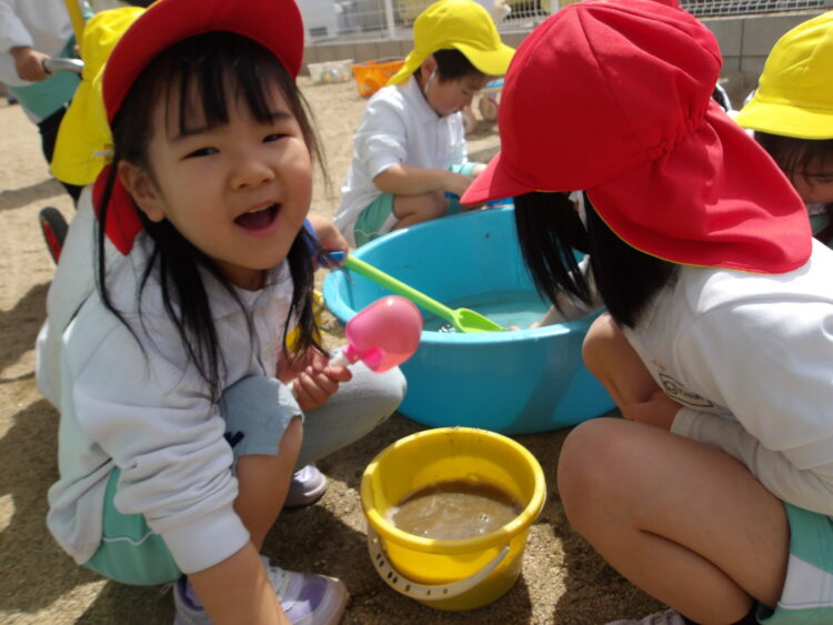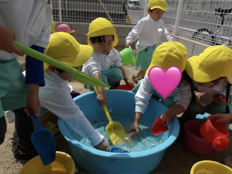 大きなスコップで水をすくってバケツに入れている子や小さなスコップで一生懸命水をすくっている子もいました!ニッコニコな笑顔です😆