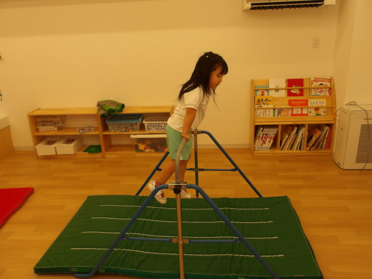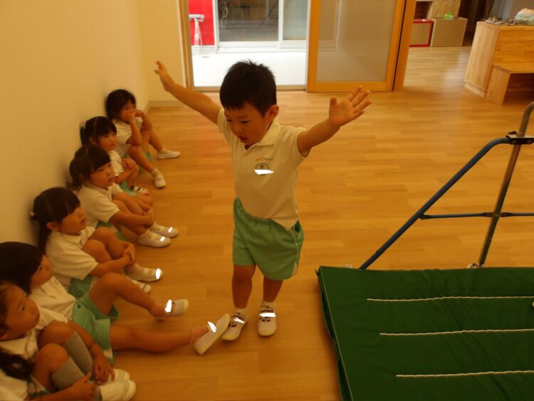 跳び箱ゾーンで、一人開脚跳びにチャレンジする年長さんは、みんながおままごとやお店屋さんごっこに家族ごっこを始めても…ずぅ〜っと、額に汗が滲むまで跳び箱チャレンジに励んでいました。