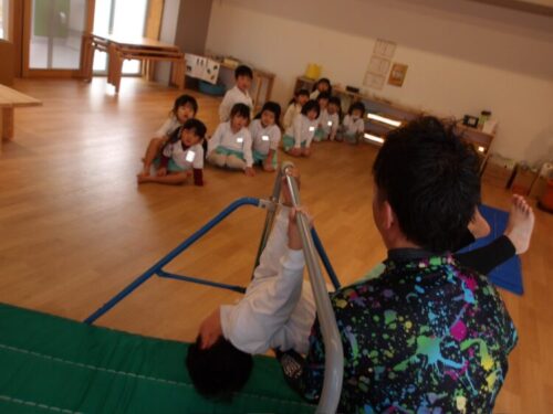 よ~く見ていた、そら組にじ組KIDSたちは、お手本を一生懸命真似っこして、【腕を曲げて】【お腹は鉄棒にくっつけて】のポイントを押さえて、何回も何回もやってみようとチャレンジしていました!😄