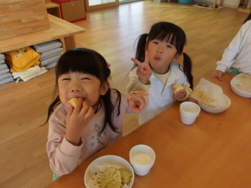 年長さんと年中さんにピーラーで皮を剥く作業をしてもらいました!