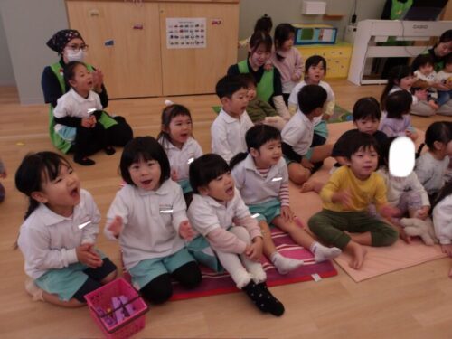 『いろいろぼうや』や『おおかみさん今何時?』の遊び等、たくさんの集団遊びを通して、体を思いっきり動かして、寒い中でも元気に遊びました🌤️😁