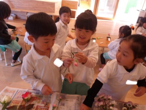 今日は大きなバラが届いており、みんなが知っている花だったので「バラだー!」と興味を持って取り組めました🌹