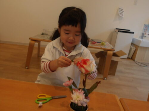 茎の長さも自分で調節し決めながらハサミでカットし、隣同士で背比べしたりしてアートを楽しみました🎶