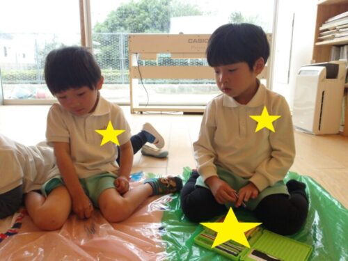 大きなこいのぼりも製作中で、カラーポリ袋に絵を描いたりシールを貼って模様にしたり・・・😆 みんなで作った大きなこいのぼり、屋上に飾るのが楽しみです👍✨