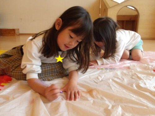 初めての絵の具遊びに戸惑っていたお友だちもいましたが、周りの友だちの姿を見て「やってみるー✨」と筆を使ってヌリヌリ🖌