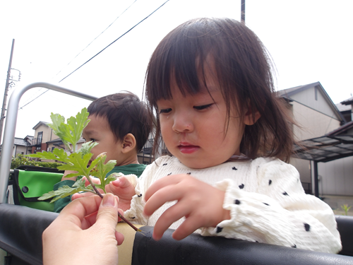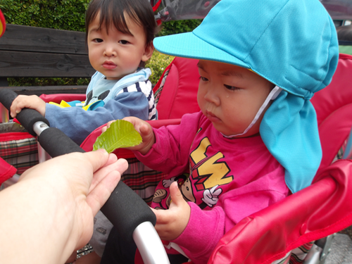 「大きい葉っぱだね!!いい匂いするかな?」と先生が言うと