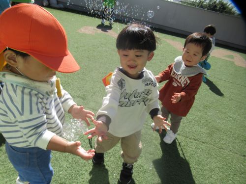 つかまえた!!!とお友だちとシャボン玉を仲良く捕まえて嬉しそうにしている様子です😆✨