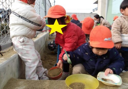 お友だちの真似をして同じものを用意したり、カップに砂を入れて見せ合ったりと同じ遊びの楽しさを共感しながら遊んでいる姿がありました😄