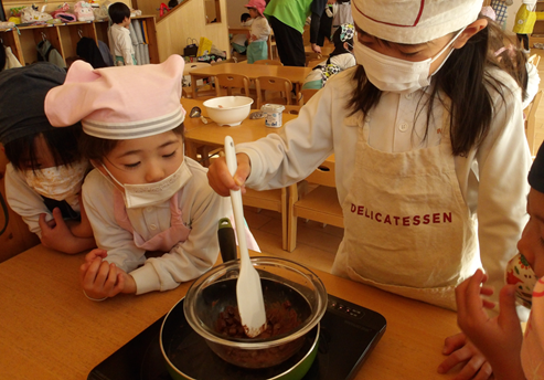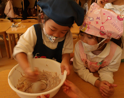 湯煎したチョコレートをボール入れ、「あともう少しだよ~」と協力して入れてくれました![]()