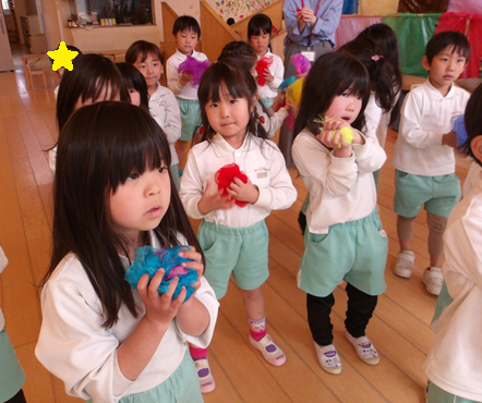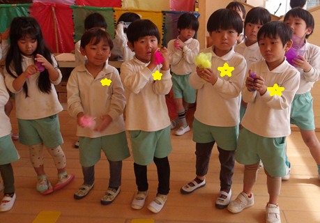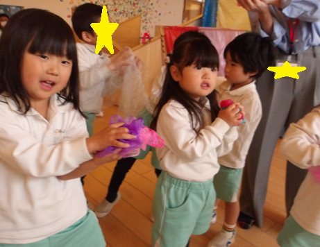みんなの大好きな「おはながわらった」の曲が流れるとリトミックスカーフを使ってお友だちと向き合ったりと