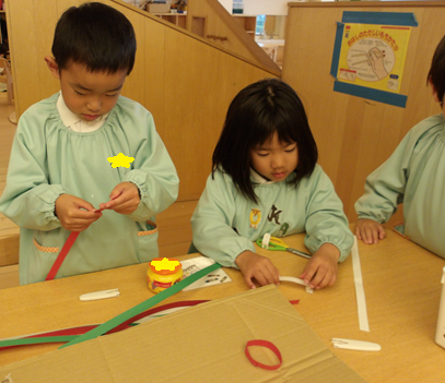 製作コーナーでは、きりん組さんに紙を切ってもらい、うさぎ組、ぱんだ組さんは紙にのりで付け迷路みたいなのができてるが…