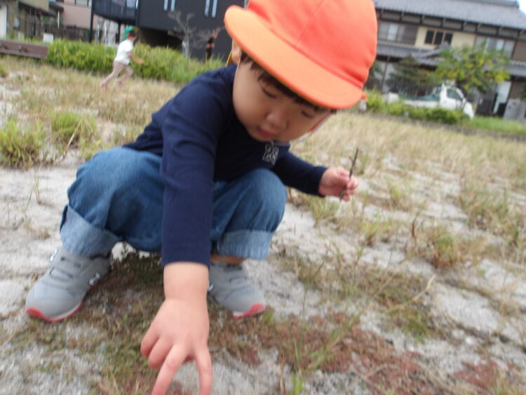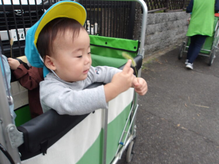 ひよこ組さんはカートに乗って出かけました。道端のねこじゃらしが気になってツンツンと触っていました🤭