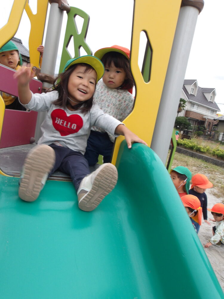 公園に到着して、「遊んでいいいよ」の先生の声掛けに、子どもたちが一斉に向かったのはすべり台!!とっても楽しそうに滑っていました😄💗
