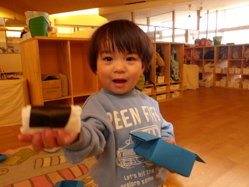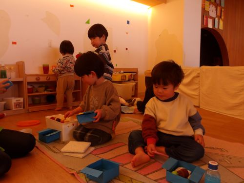 ピクニックごっこではおままごとのおもちゃも使って自分のお弁当箱の中に食べ物をたくさん入れて楽しみましたよ☺