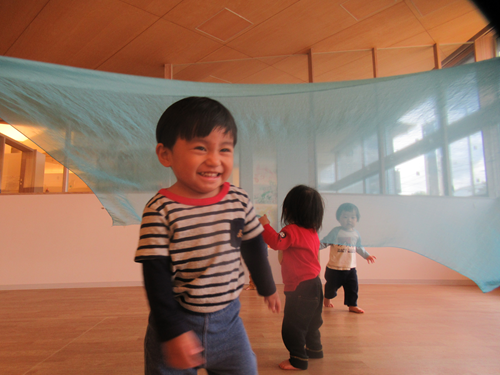 おおきなスカーフはおばけのようで、ハロウィンムードのこどもたちには