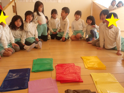 素材あそびチームはカラーポリ袋を使って素材をたのしみました!