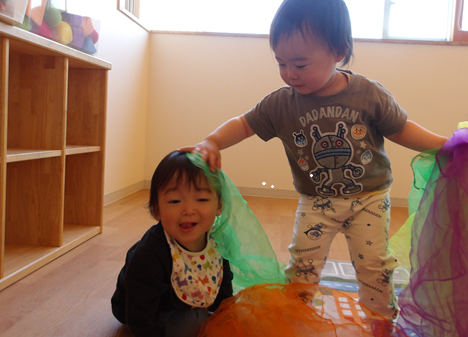 ひよこ組さんはお部屋の中でリトミックスカーフで遊んだり、風船などを触ったりしてゆったり遊びました😄