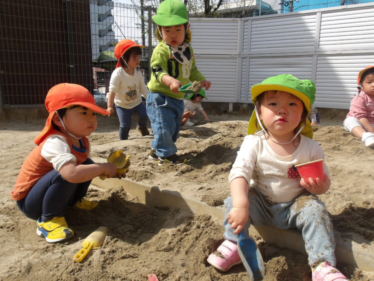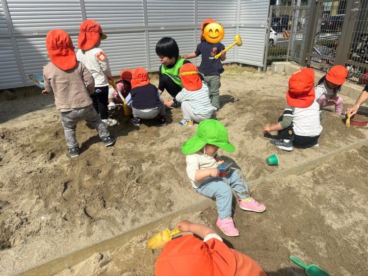 今日はお天気も良く園庭で遊びました。休み明けでママー💦と泣いてしまった子も遊んでいくうちに笑顔になって砂場でスコップを使って砂遊びをしたり、道路側のフェンスから車を見たり楽しく遊べました!