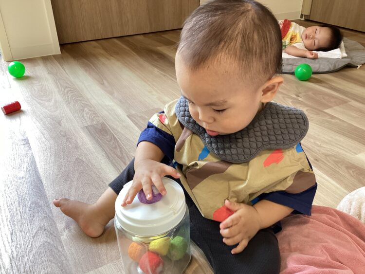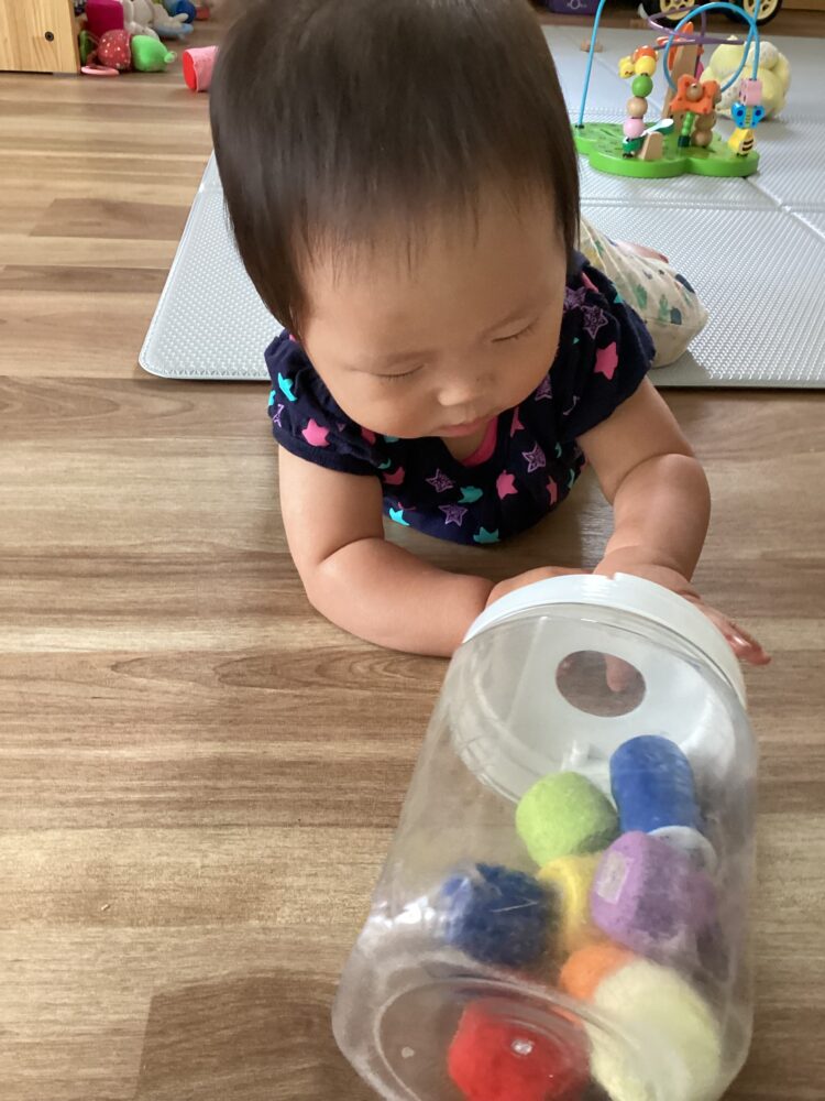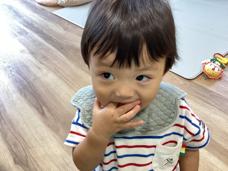 いないいないばあの歌を歌うと手を顔の前に持って行きばあを楽しんでいました