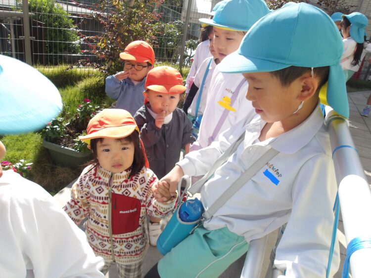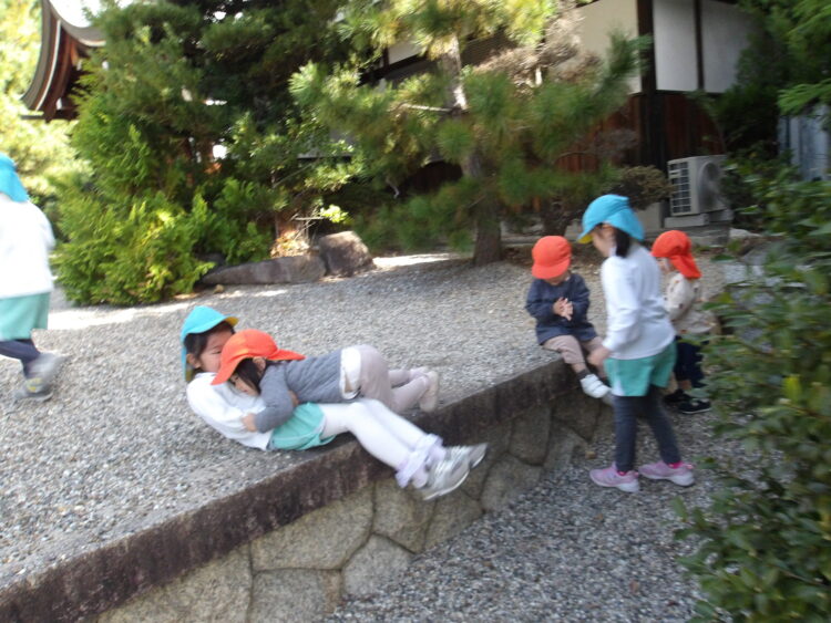 舎利殿では、「水筒持っている子は水筒置いてお茶を飲んでね〜、小さい子にも教えてあげてね〜!?との先生の声に、あひる組さんの水筒を持っている子をお手伝いをしたり、着いても手を繋ぎ一緒に段差を登ったり降りたりして楽しんでいましたよ![]()