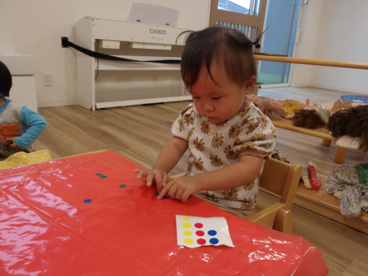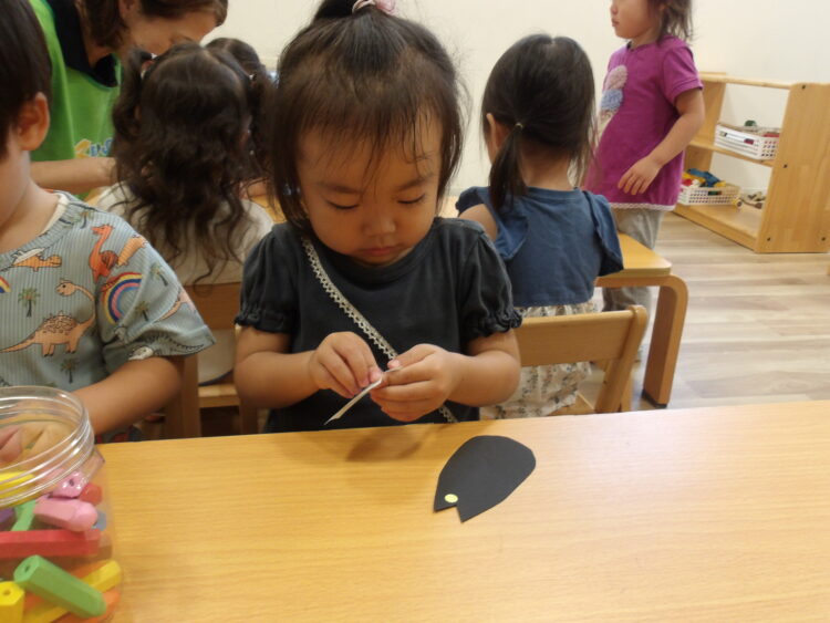「どこに貼ろうかな💭」と集中しながら貼り進めていました🥰 うさぎ組さんはコウモリにシールをはったり、くれぴつで口を描いていました🥰