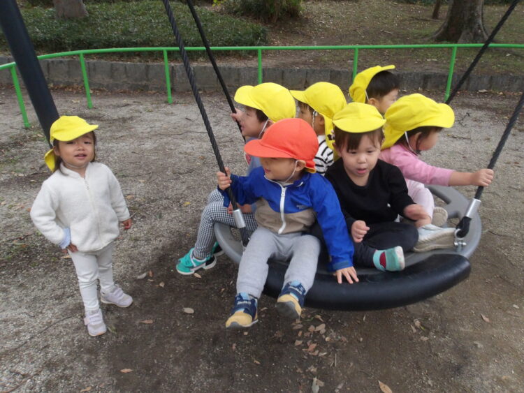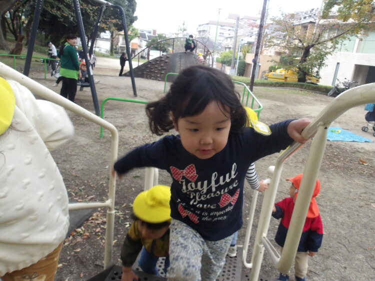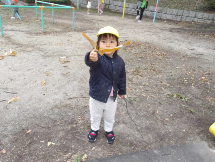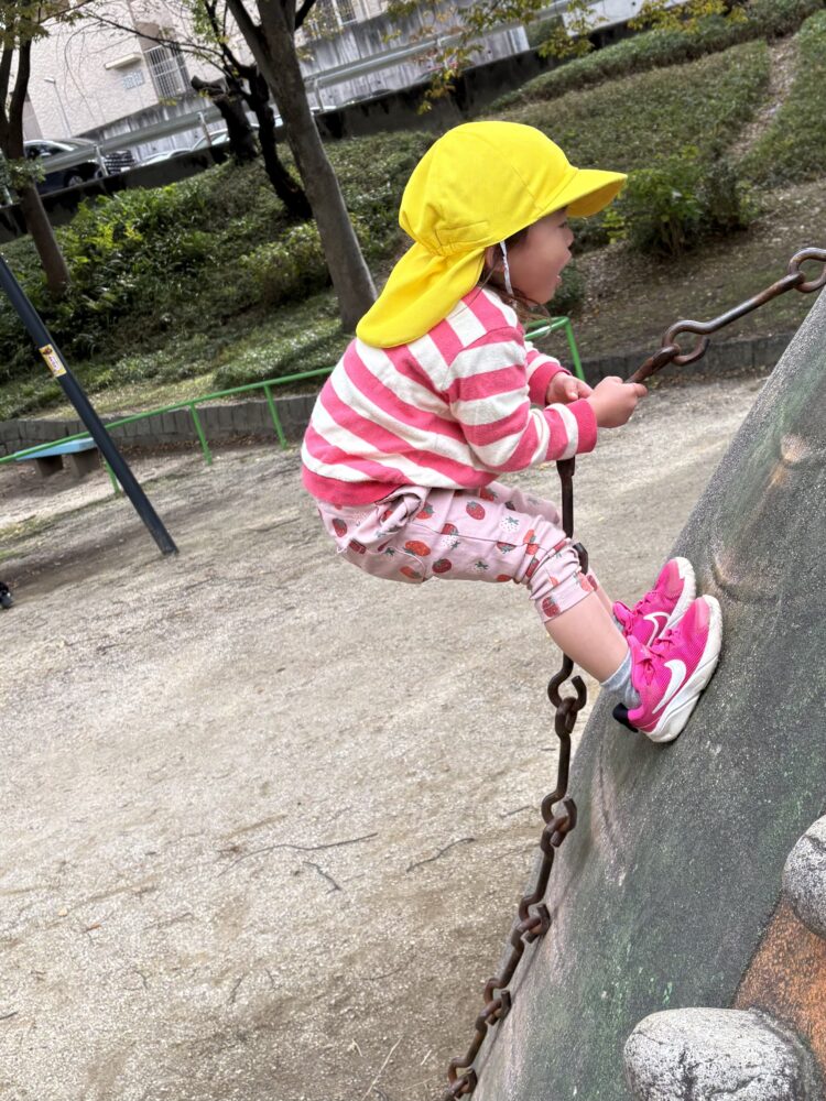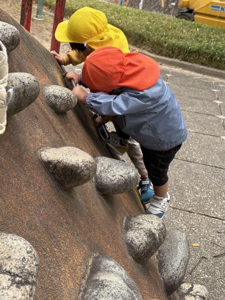 葉っぱや木でたくさん遊んだり、コンクリートの滑り台では自分では難しい鎖⛓️を持って先生の教えてもらったりして登っていましたよ![]()