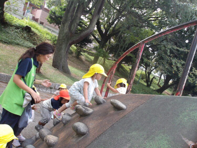 今日は少し足を伸ばして西山公園に出かけました。大きな滑り台を滑ります! ひよこぐみのお友達も滑るよ😄